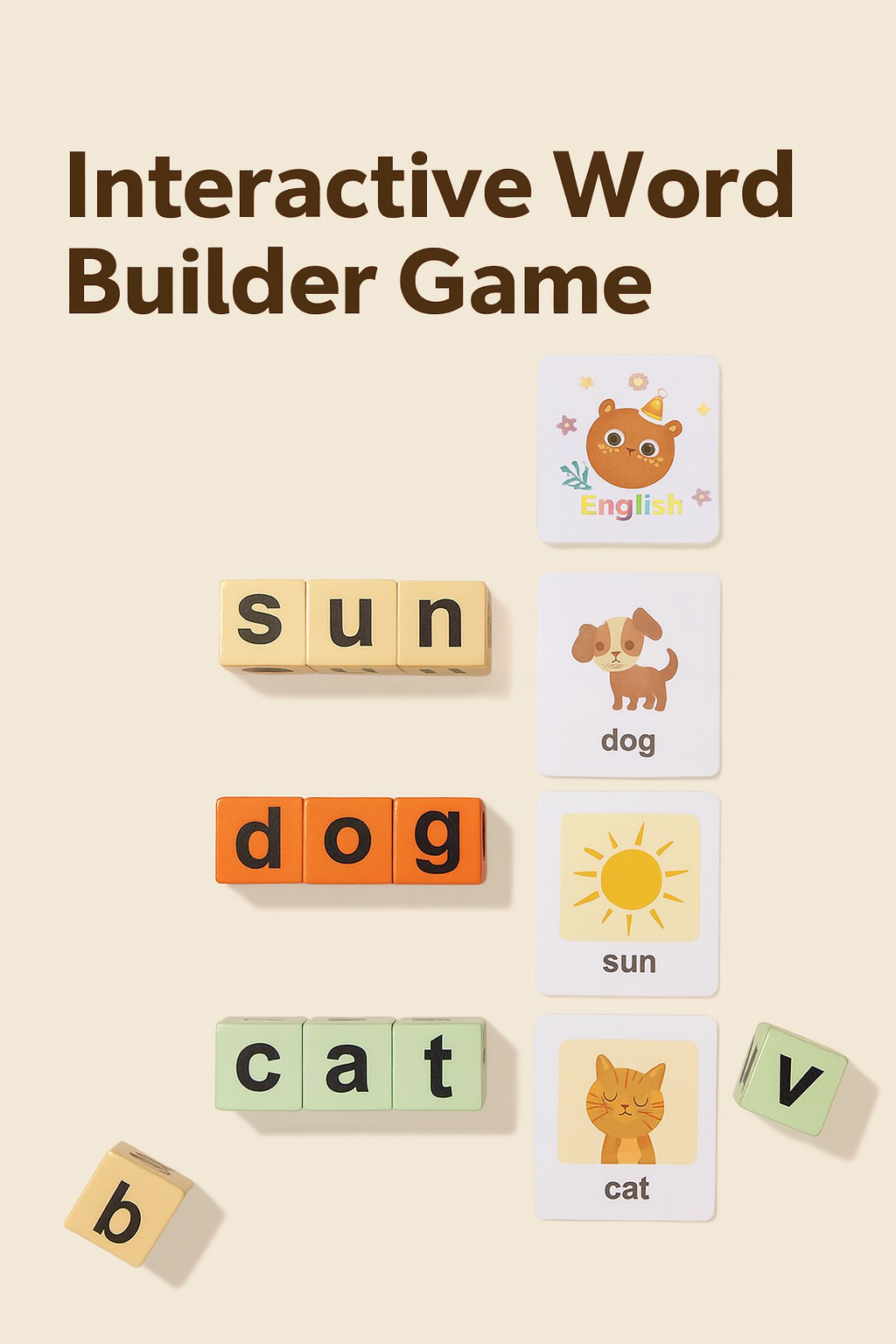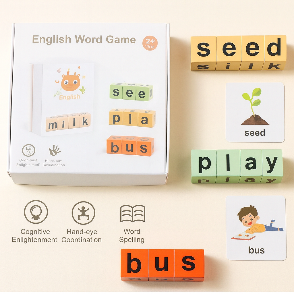 RWF 24,000 Save 20%Make spelling fun and interactive with the English Word Builder Game, designed to help children aged 3 and up master vocabulary, spelling, and letter recognition through hands-on play. Product Features: 🔤 Colorful Letter Blocks Easy-to-handle cubes help kids spell words like “lion,” “milk,” “bus,” and more. Illustrated Flashcards Each card features a friendly image and matching word to reinforce visual learning. Match & Spell Activity Children match blocks to cards, building confidence in spelling and word recognition. What’s Included: 26+ Letter Blocks 50+ Illustrated Flashcards Storage Box Recommended Age: 3 years and above