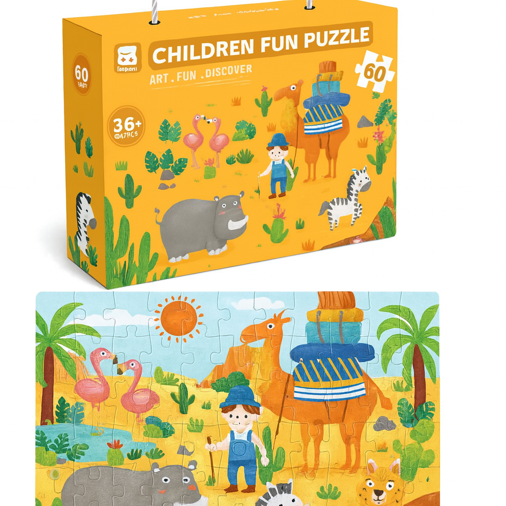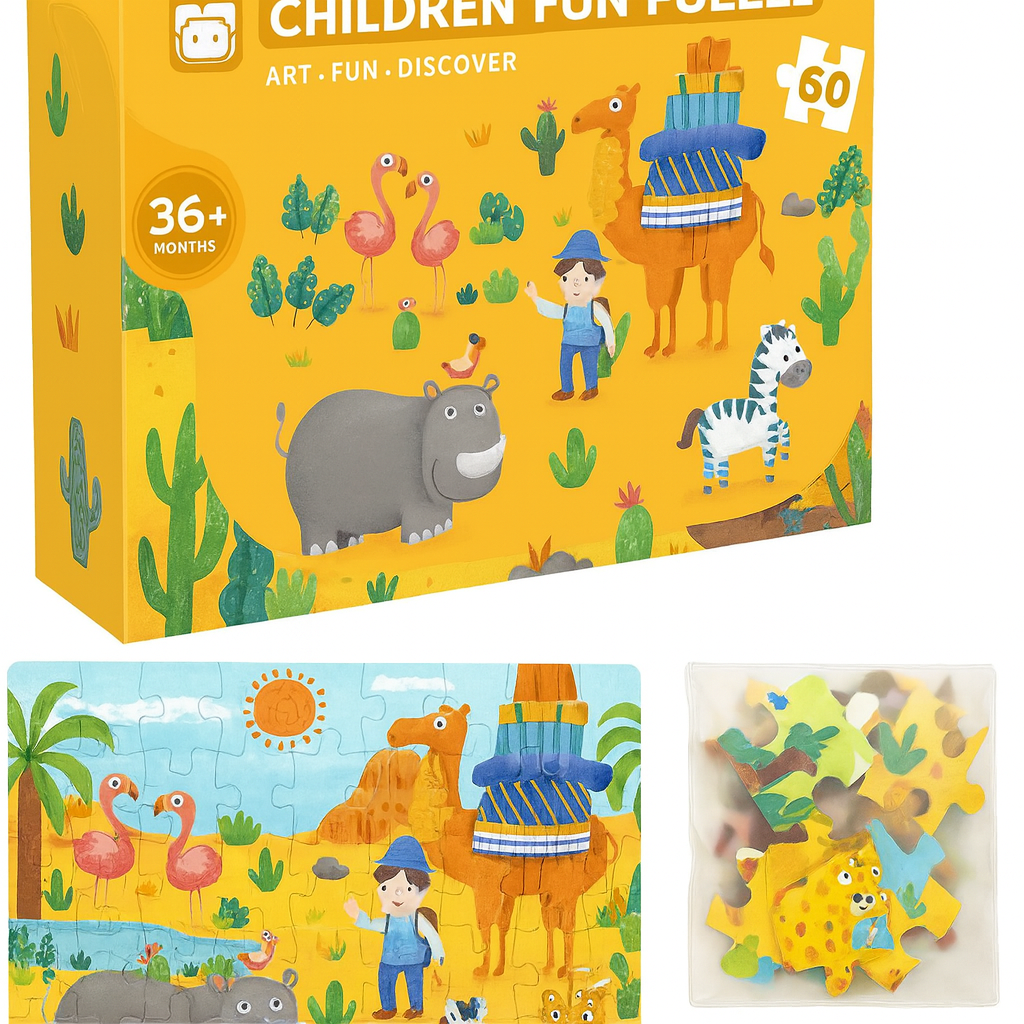 RWF 30,000 Save 20%Spark your child’s imagination with the Children Fun Puzzle, a vibrant 60-piece jigsaw designed for kids aged 36 months and older. This engaging puzzle features a lively desert landscape filled with friendly animals like flamingos, a hippopotamus, camel, zebra, and cheetah, alongside a cheerful explorer character. 🌟 Product Highlights: Age Suitability: 36+ months Piece Count: 60 durable, easy-to-handle pieces Puzzle Size: 44 cm x 31 cm when completed Box Dimensions: 21 cm x 15 cm x 5.5 cm – compact and gift-ready Packaging: Colorful box with handle + resealable zipper bag for storage Educational Value: Enhances fine motor skills, problem-solving, and animal recognition