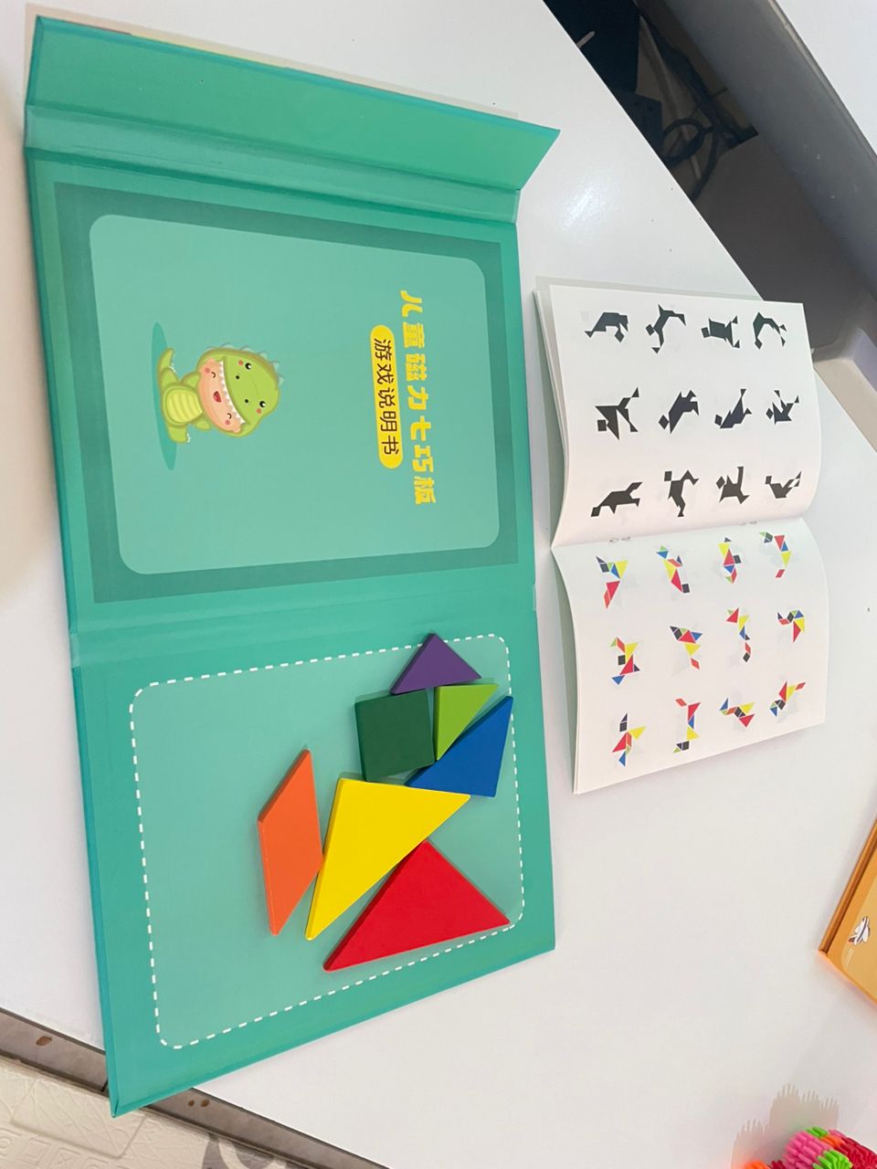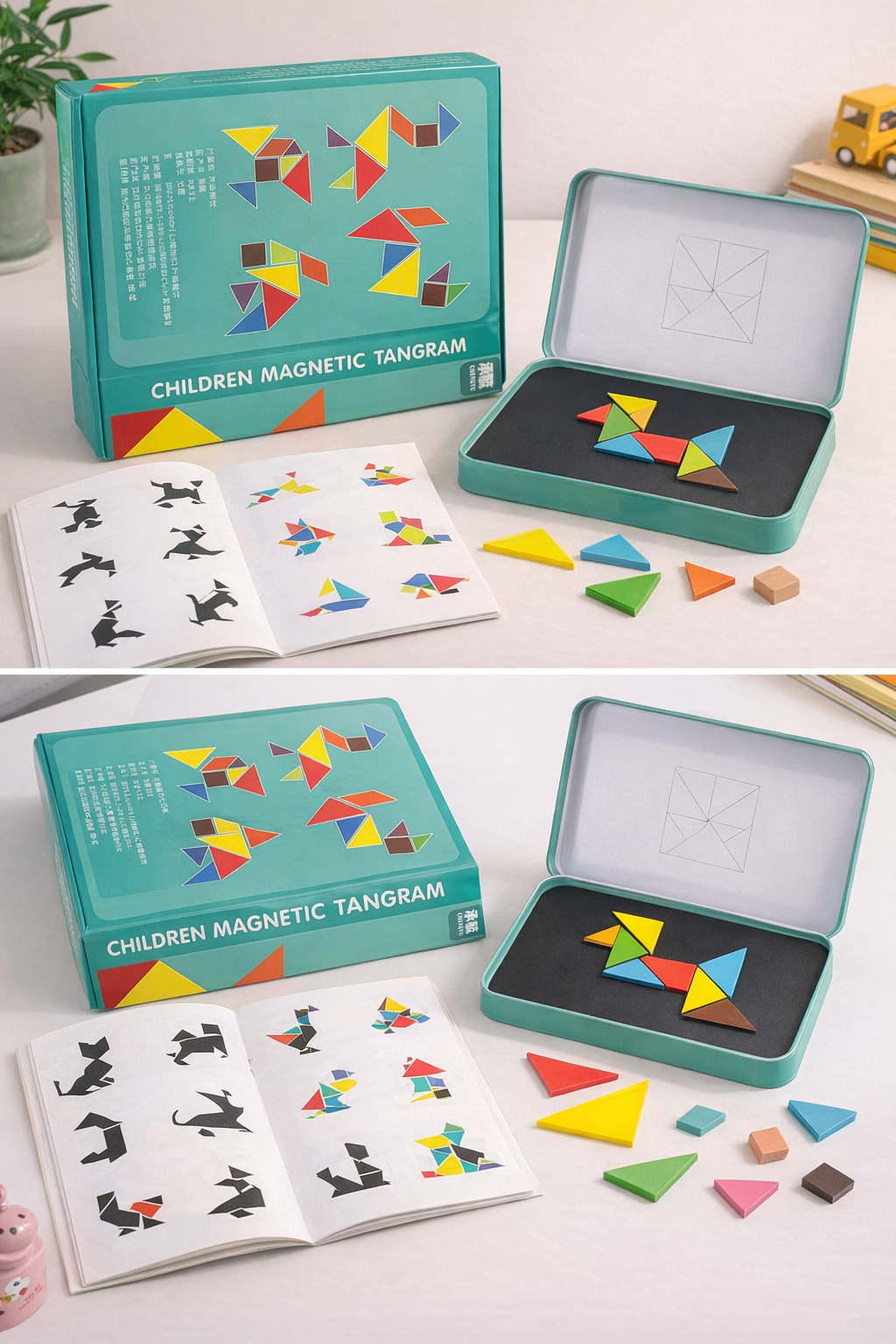 RWF 6,000 Save 20%This magnetic tangram set helps children learn shapes, colors, and problem-solving. Kids match colorful pieces to pictures in the book to make animals, objects, and fun designs. The pieces stick to the book so they don’t fall off. It’s great for learning and play at home or school. What’s Inside: A puzzle book with pictures to solve Bright magnetic shapes in different colors A strong box to keep everything safe Why It’s Good: Helps kids think and solve problems Builds creativity and focus Easy to carry and fun to use